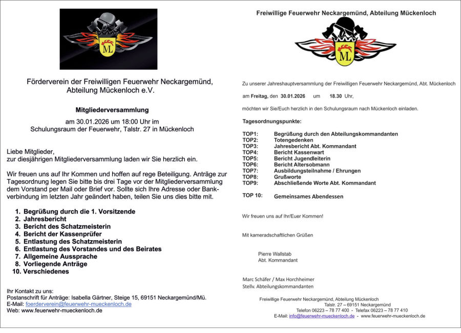 Bei der Jahreshauptversammlung des Fördervereins der Freiwilligen Feuerwehr Neckargemünd, Abteilung Mückenloch, begrüßte die Erste Vorsitzende Isabella Gärtner die anwesenden Vereinsmitglieder und trug ihren Jahresbericht 2024 vor. Unterstützung aus den Reihen des Fördervereins bekamen die Aktiven beim „Rock in den Vatertag“ sowie beim Martinsumzug und beim Weihnachtsmarkt. Mit den finanziellen Mitteln konnten Beschaffungen wie ein Profi-Faltzelt sowie Spezialwerkzeug zur Fensteröffnung beschafft werden.