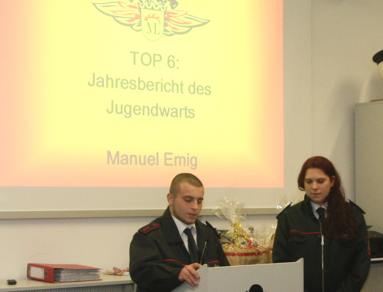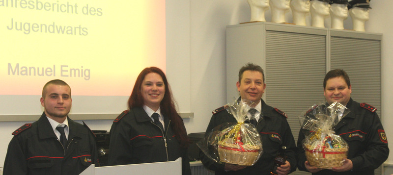 Für die Jugendfeuerwehr konnte der seit einem halben Jahr im Amt stehende Manuel Emig zusammen mit seiner Stellvertreterin Manuela Hofmann von einem in jeder Hinsicht gelungenen und erfolgreichen Jahr berichten. Auch hier hat sich die Zahl des Nachwuchses erhöht. Auch das Kinderfest ist ein voller Erfolg und wird ein fester Bestandteil im Veranstaltungskalender bleiben. Manuel Emig bedankte sich auch nochmal bei Ute Kaltschmidt die mit Ihrer Aktion "Mückenloch hilft Helfen" Spenden sammelte und jeweils die Hälfte der Einnahmen an die Jugendfeuerwehr und die Kinderklinik Heidelberg Abt. Neuro spendete. Als Anerkennung für ihre Unterstützung der Jugendfeuerwehr, bekamen der Abteilungskommandant Pierre Wallstab und sein Stellvertreter Thomas Schippl von der Jugendführung noch ein Präsent überreicht.