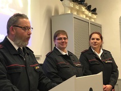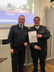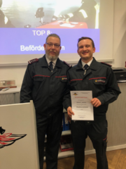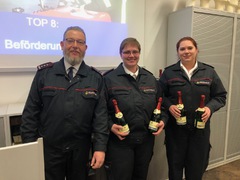 Bei den Beförderungen bekam Sandra Ziegler Ihren ersten Stern auf die Schulter und wurde damit zur Feuerwehrfrau befördert. Einen dritten Stern bekam Emanuel Jaworek, der zum Hauptfeuerwehrmann befördert wurde. Sandra Ziegler und Manuela Hofmann beglückwünschte der Kommandant noch für den absolvierten Jugendgruppenleiterlehrgang den die beiden im November in Neustadt absolvierten. Manuela Hofmann absolvierte außerdem an der Landesfeuerwehrschule in Bruchsal einen eintägigen Lehrgang zum Thema „Kindergruppen in der Feuerwehr“.